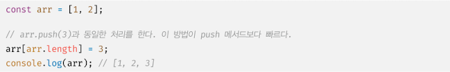 마지막 요소로 추가할 요소가 하나뿐이라면 push 메서드를 사용하지 않고 length 프로퍼티를 사용하여 배열의 마지막에 요소를 직접 추가할 수도 있다. 이 방법이 push 메서드보다 빠르다.