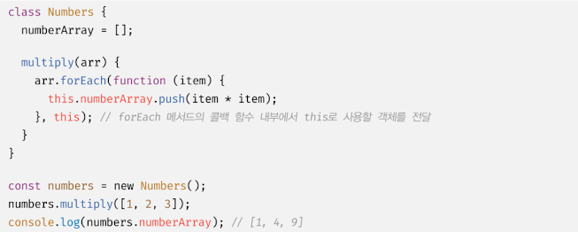 forEach 메서드의 콜백 함수는 일반 함수로 호출되므로 콜백 함수 내부의 this는 undefined를 가리킨다. this 가 전역 객체가 아닌 undefined 를 가리키는 이유는 클래스 내부의 모든 코드에는 암묵적으로 strict mode가 적용되기 때문이다.