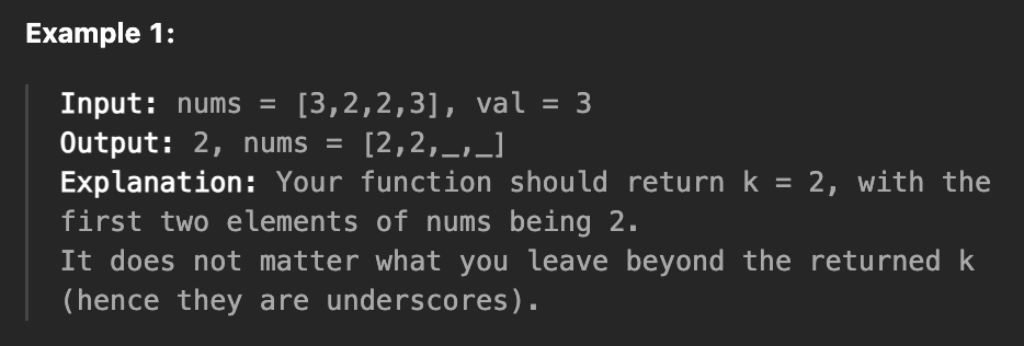 순회하며, if (num !== val) 에서 val이 아닌 값을 발견하면 nums[current] 자리에 옮겨 담고, current를 1 증가시킨다. 즉, val을 “건너뛰며” 유효한 값만 앞으로 모은다. 그리고 current 는 곧 유효한 값들의 총 수가 된다.