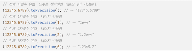 toPrecision 메서드는 인수로 전달받은 전체 자릿수까지 유효하도록 나머지 자릿수를 반올림하여 문자열로 반환한다. 인수로 전달받은 전체 자릿수로 표현할 수 없는 경우 지수 표기법으로 결과를 반환한다.