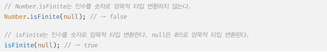 빌트인 전역 함수 isFinite는 전달받은 인수를 숫자로 암묵적 타입 변환하여 검사를 수행하지만 Number.isFinite 는 전달받은 인수를 숫자로 암묵적 타입 변환하지 않는다. 따라서 숫자가 아닌 인수가 주어졌을 때 반환값은 언제나 false다.