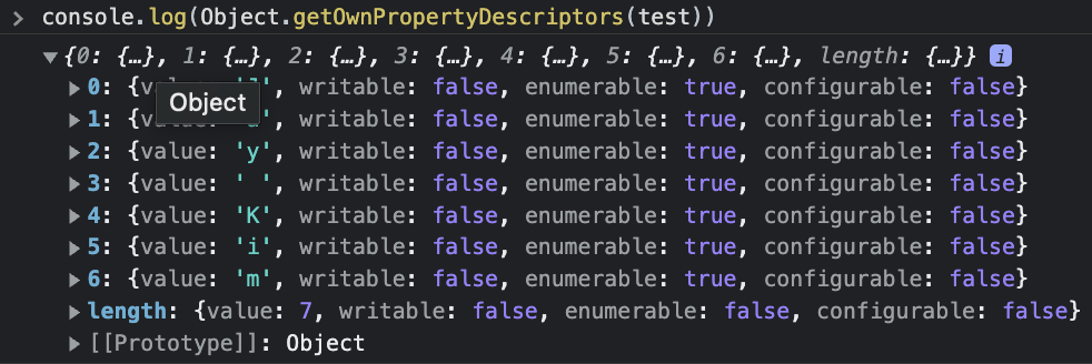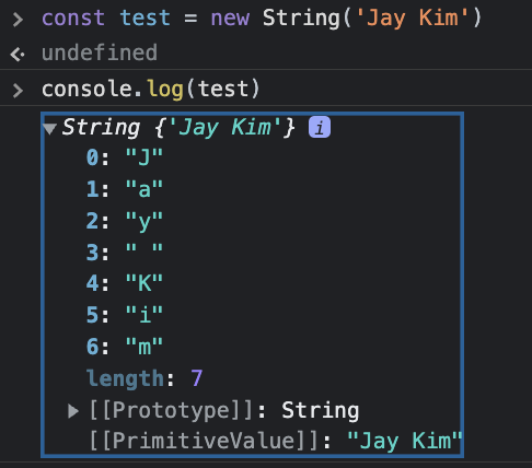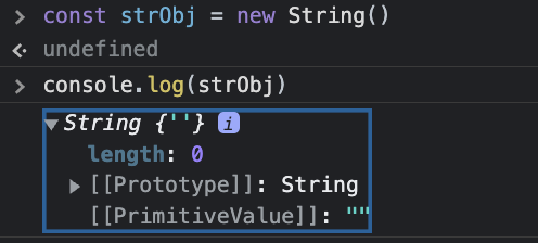 크롬 브라우저의 개발자 도구에서 실행해보면 [[PrimitiveValue]]라는 접근할 수 없는 프로퍼티가 보인다. 이는 [[StringData]] 내부 슬롯을 가리킨다. ES5에서는 [[StringData]]를 [[PrimitiveValue]]라 불렀다.