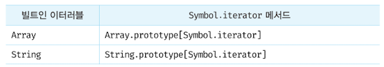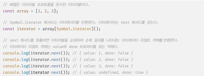 Well-known Symbol   인 Symbol.iterator를 프로퍼티 키로 사용한 메서드를 직접 구현하거나 프로토타입 체인을 통해 상속받은 Symbol.iterator 메서드를 호출하면 이터레이터 프로토콜을 준수한 이터레이터를 반환한다. 이러한 규약을 이터러블 프로토콜이라 하며, 이터러블 프로토콜을 준수한 객체를 이터러블이라 한다. 이터러블은 for...of 문으로 순회할 수 있으며 스프레드 문법과 배열 디스트럭처링 할당의 대상으로 사용할 수 있다.
