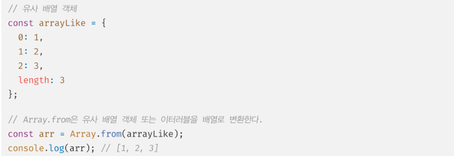 위 예제의 arrayLike 객체는 유사 배열 객체지만 이터러블이 아니다. 다만 ES6에서 도입된 Array.from 메서드를 사용하여 배열로 간단히 변환할 수 있다. Array.from 메서드는 유사 배열 객체 또는 이터러블을 인수