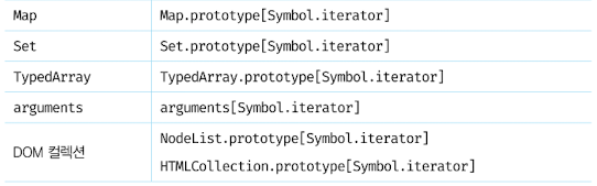 for...of 문, 스프레드 문법, 배열 디스트럭처링 할당 등은 Array, String, Map, Set, TypedArray(Int8Array, Uint8Array, Uint8ClampedArray, Int16Array, Uint16Array, Int32Array, Uint32Array, Float32Array, Float64Array), DOM 컬렉션(NodeList, HTMLCollection), arguments와 같이 다양한 데이터 소스를 사용할 수 있다.