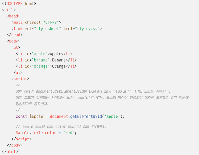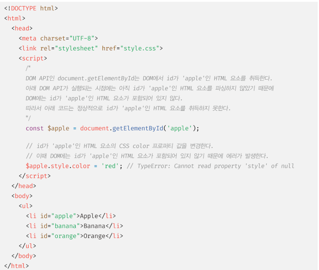 위 예제의 경우 app.js의 파싱과 실행 이전까지는 DOM의 생성이 일시 중단된다. 이때 자바스크립트 코드(app.js)에서 DOM이나 CSSOM을 변경하는 DOM API를 사용할 경우 DOM이나 CSSOM이 이미 생성되어 있어야 한다. 만약 DOM을 변경하는 DOM API를 사용할 때 DOM의 생성이 완료되지 않은 상태라면 문제가 발생할 수 있다.