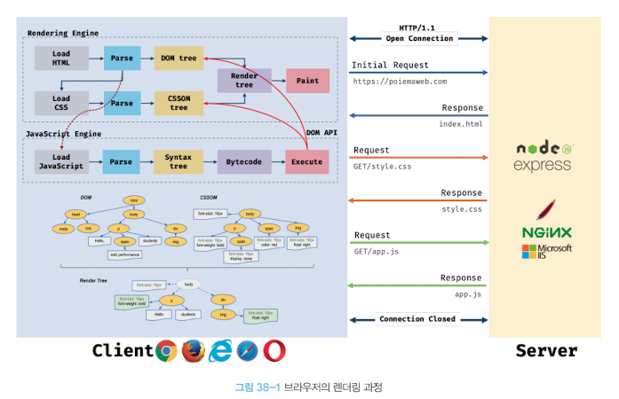 브라우저의 핵심 기능은 필요한 리소스(HTML, CSS, 자바스크립트, 이미지, 폰트 등의 정적 파일 또는 서버가 동적으로 생성한 데이터)를 서버에 요청request하고 서버로부터 응답response받아 브라우저에 시각적으로 렌더링하는 것이다. 즉, 렌더링에 필요한 리소스는 모두 서버에 존재하므로 필요한 리소스를 서버에 요청하고 서버가 응답한 리소스를 파싱하여 렌더링하는 것이다.
