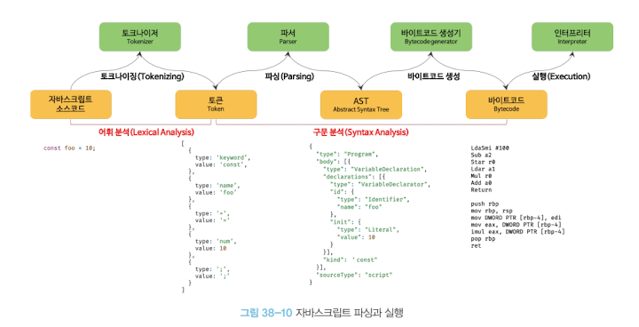 자바스크립트 엔진은 자바스크립트 코드를 파싱하여 CPU 가 이해할 수 있는 low-level language 로 변환하고 실행한다. 이 엔진은 자바스크립트를 해석하여 추상적 구문 트리를 생성한다. 그리고 이를 기반으로 인터프리터가 실행할 수 있는 중간 코드인 바이트코드를 생성하여 실행한다.