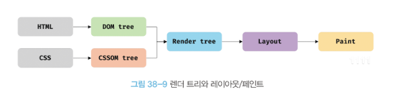 - 자바스크립트는 자바스크립트 엔진이 처리하는데, HTML 파서는 script 태그를 만나면 자바스크립트 코드를 실행하기 위해 DOM 생성 프로세스를 중지하고 자바스크립트 엔진으로 제어 권한을 넘긴다. 제어 권한을 넘겨 받은 자바스크립트 엔진은 script 태그 내의 스크립트 코드 또는 script 태그의 src 어트리뷰트에 정의된 자바스크립트 파일을 로드하고 파싱하여 실행한다. 자바스크립트의 실행이 완료되면 다시 HTML 파서로 제어 권한을 넘겨서 브라우저가 중지했던 시점부터 DOM 생성을 재개한다.