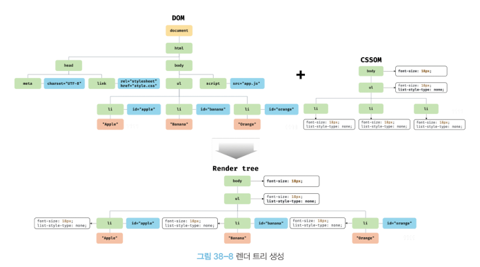 2. 브라우저의 렌더링 엔진은 서버로부터 응답된 HTML과 CSS를 파싱하여 DOM과 CSSOM을 생성하고 이들을 결합하여 렌더 트리를 생성한다.