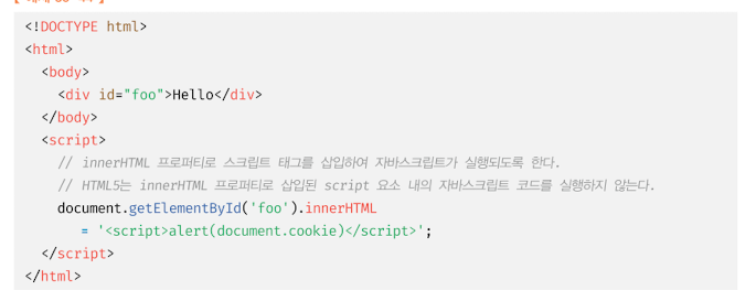 HTML5는 innerHTML 프로퍼티로 삽입된 script 요소 내의 자바스크립트 코드를 실행하지 않는다.