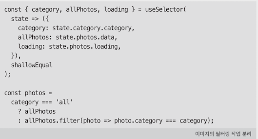 따라서 filter로 새로운 배열을 꺼내는 대신 state.photos.data와 state.category.category를 따로 꺼낸 후, useSelector 밖에서 필터링해야 합니다. 왼쪽에서 오른쪽으로 개선합니다.
