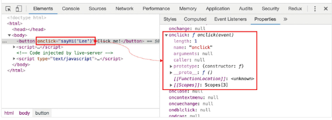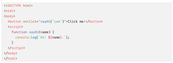 이벤트 핸들러 어트리뷰트 값은 사실 암묵적으로 생성될 이벤트 핸들러의 함수 몸체를 의미한다. 즉, onclick="sayHi('Lee')" 어트리뷰트는 파싱되어 다음과 같은 함수를 암묵적으로 생성하고, 이벤트 핸들러 어트리뷰트 이름과 동일한 키 onclick 이벤트 핸들러 프로퍼티에 할당한다.