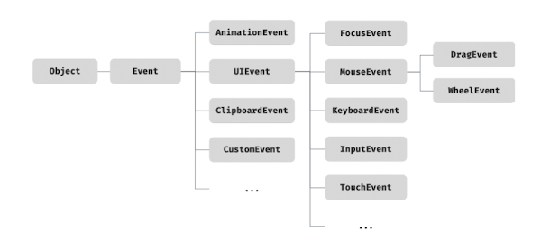 Event 인터페이스는 DOM 내에서 발생한 이벤트에 의해 생성되는 이벤트 객체를 나타낸다. Event 인터페이스에는 모든 이벤트 객체의 공통 프로퍼티가 정의되어 있고 FocusEvent, MouseEvent, KeyboardEvent, WheelEvent 같은 하위 인터페이스에는 이벤트 타입에 따라 고유한 프로퍼티가 정의되어 있다.