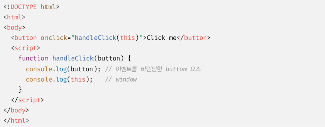 일반 함수로서 호출되는 함수 내부의 this 는 전역 객체를 가리킨다. 따라서 handleClick 함수 내부의 this는 전역 객체 window를 가리킨다. 단, 이벤트 핸들러를 호출할 때 인수로 전달한 this는 이벤트를 바인딩한 DOM 요소를 가리킨다.