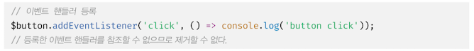 addEventListener 메서드로 등록한 이벤트 핸들러를 제거하려면 EventTarget.prototype.removeEvent Listener 메서드를 사용한다. 단, 무명 함수를 이벤트 핸들러로 등록한 경우 제거할 수 없다. 이벤트 핸들러를 제거하려면 이벤트 핸들러의 참조를 변수나 자료구조에 저장하고 있어야 한다.