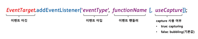 이벤트 핸들러를 등록하기 위해서는 이벤트를 발생시킬 객체인 이벤트 타깃_event target 과 이벤트의 종류를 나타내는 문자열인 이벤트 타입_event type 그리고 이벤트 핸들러를 지정할 필요가 있다.