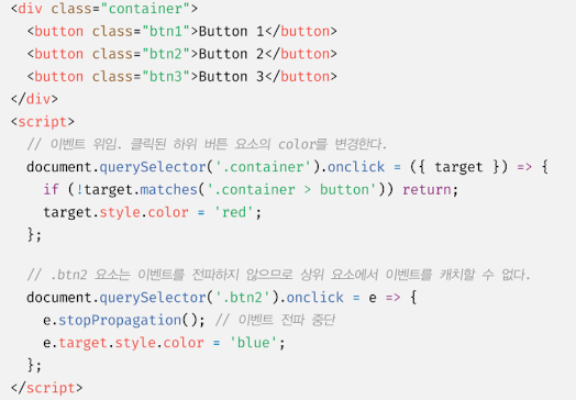 btn2 요소는 자신이 발생시킨 이벤트가 전파되는 것을 중단하여 자신에게 바인딩된 이벤트 핸들러만 실행되도록 한다.