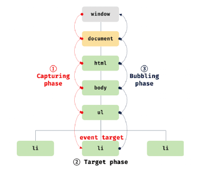 • 버블링 단계_bubbling phase: 이벤트가 하위 요소에서 상위 요소 방향으로 전파
