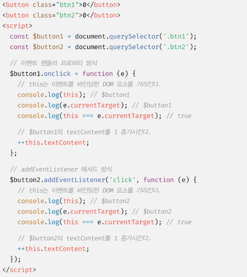 이벤트 핸들러 프로퍼티 방식과 addEventListener 메서드 방식 모두 이벤트 핸들러 내부의 this는 이벤트를 바인딩한 DOM 요소를 가리킨다. 이벤트 핸들러 내부의 this는 이벤트 객체의 currentTarget 프로퍼티와 같다.