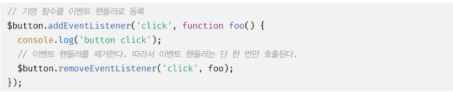 단, 기명 이벤트 핸들러 내부에서 removeEventListener 메서드를 호출하여 이벤트 핸들러를 제거하는 것은 가능하다. 이때 이벤트 핸들러는 단 한 번만 호출된다. 다음 예제의 경우 버튼 요소를 여러 번 클릭해도 단 한 번만 이벤트 핸들러가 호출된다.