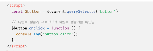이벤트 핸들러는 이벤트 타깃 또는 전파된 이벤트를 캐치할 DOM 노드 객체에 바인딩한다. 앞서 살펴본 이벤트 핸들러 어트리뷰트 방식도 결국 DOM 노드 객체의 이벤트 핸들러 프로퍼티로 변환되므로 결과적으로 이벤트 핸들러 프로퍼티 방식과 동일하다고 할 수 있다.