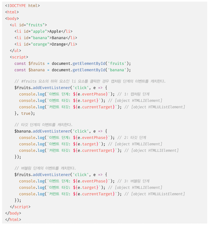addEventListener 메서드 방식으로 등록한 이벤트 핸들러는 타깃 단계와 버블링 단계뿐만 아니라 캡처링 단계의 이벤트도 선별적으로 캐치할 수 있다. 캡처링 단계의 이벤트를 캐치하려면 addEventListener 메서드의 3번째 인수로 true를 전달해야 한다. 3번째 인수를 생략하거나 falseㅌ를 전달하면 타깃 단계와 버블링 단계의 이벤트만 캐치할 수 있다.