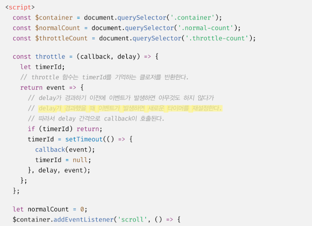 실무에서는 Underscore의 throttle 함수나 Lodash의 throttle 함수를 사용하는 것을 권장한다.