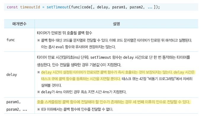 setTimeout 함수가 반환한 타이머 id를 clearTimeout 함수의 인수로 전달하여 타이머를 취소할 수 있다.