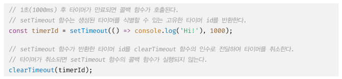 setTimeout 함수가 반환한 타이머 id를 clearTimeout 함수의 인수로 전달하여 타이머를 취소할 수 있다.