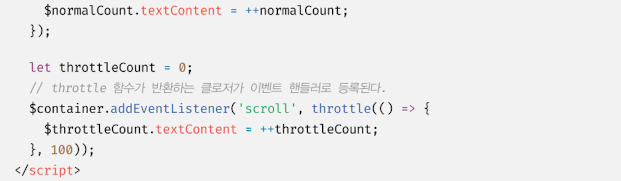 이처럼 짧은 시간 간격으로 연속해서 발생하는 이벤트를 그룹화해서 일정 시간 간격으로 이벤트 핸들러를 호출하는 스로틀은 scroll 이벤트 처리나 무한 스크롤_infinite scrolling UI 구현 등에 유용하게 사용된다.