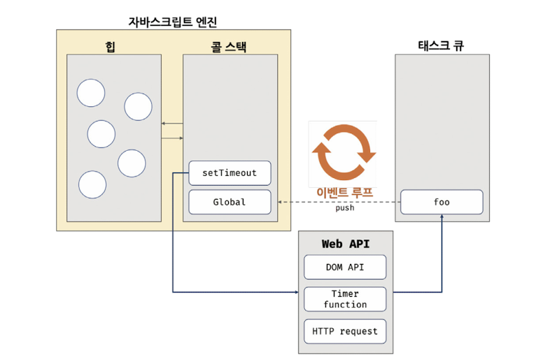 - 브라우저: 타이머 만료시 콜백함수 foo 를 태스크 큐에 푸시한다.
