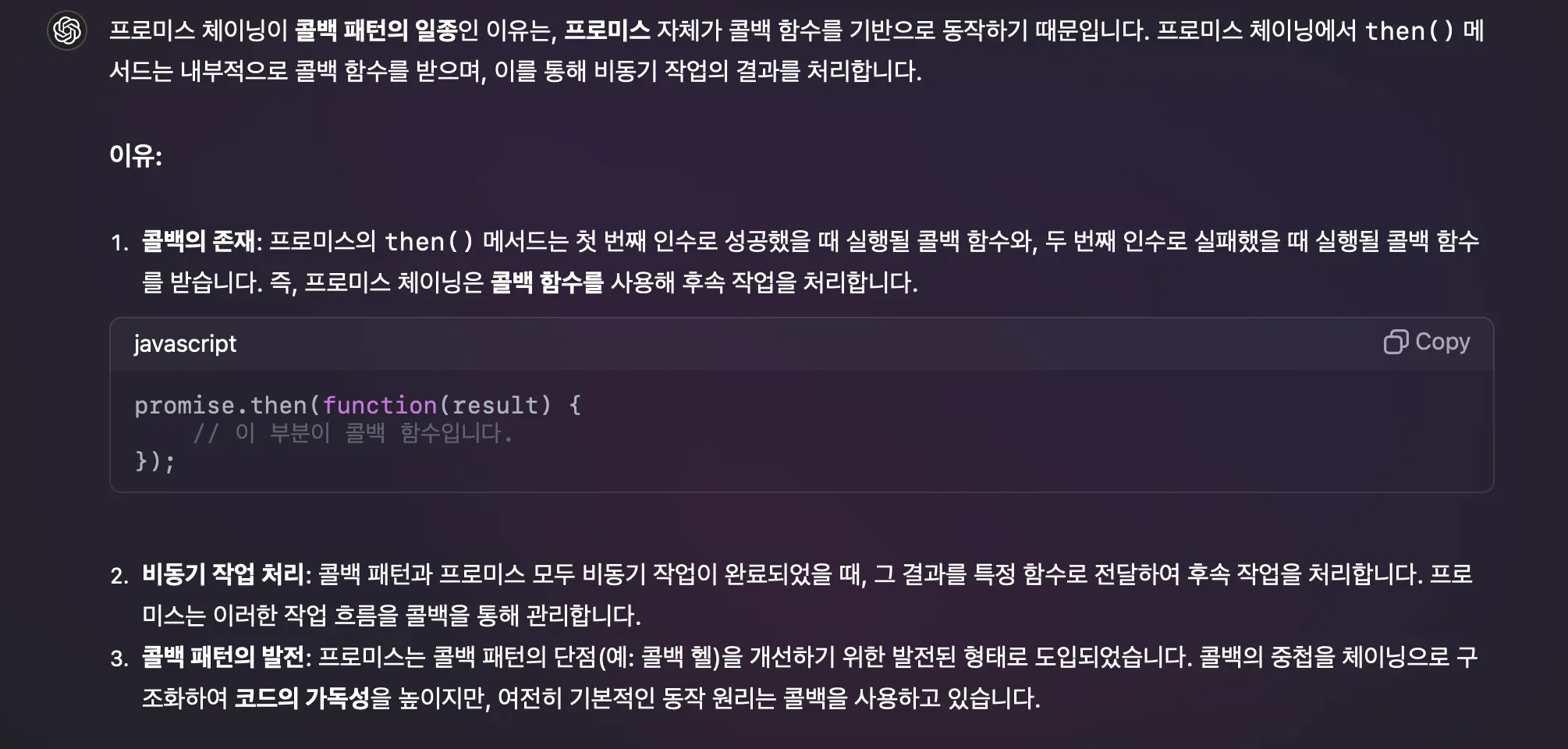 - 에러 처리 위치가 분산됨: 콜백 안에서 발생하는 에러를 처리하기 위해서는 각 콜백마다 에러 핸들링 로직을 추가해야 합니다. 이로 인해 코드가 길어지고, 에러 처리 로직이 코드 여러 부분에 분산되어 가독성이 떨어집니다.