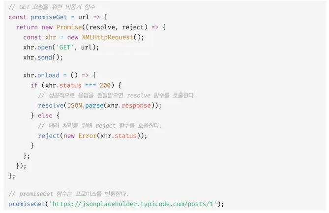 비동기 처리는 Promise 생성자 함수가 인수로 전달받은 콜백 함수 내부에서 수행한다.