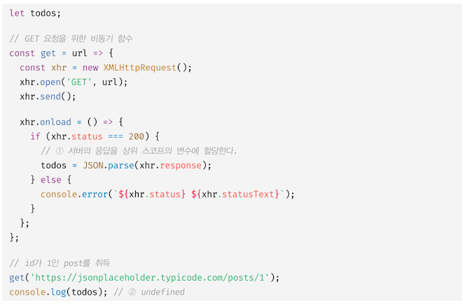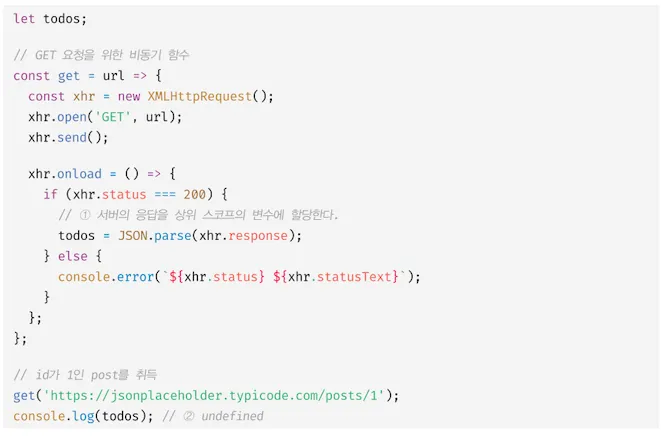 즉, 비동기 함수의 처리결과(서버의 응답 등) 에 대한 후속 처리는 비동기 함수 내부에서 수행해야 한다.