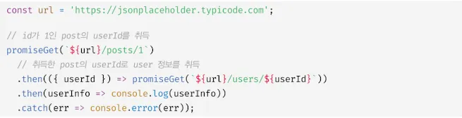 위 예제에서 then then catch 순서로 후속 처리 메서드를 호출했다. then, catch, finally 후속 처리 메서드는 언제나 프로미스를 반환하므로 연속적으로 호출할 수 있다. 이를 프로미스 체이닝_promise chaining이라 한다.