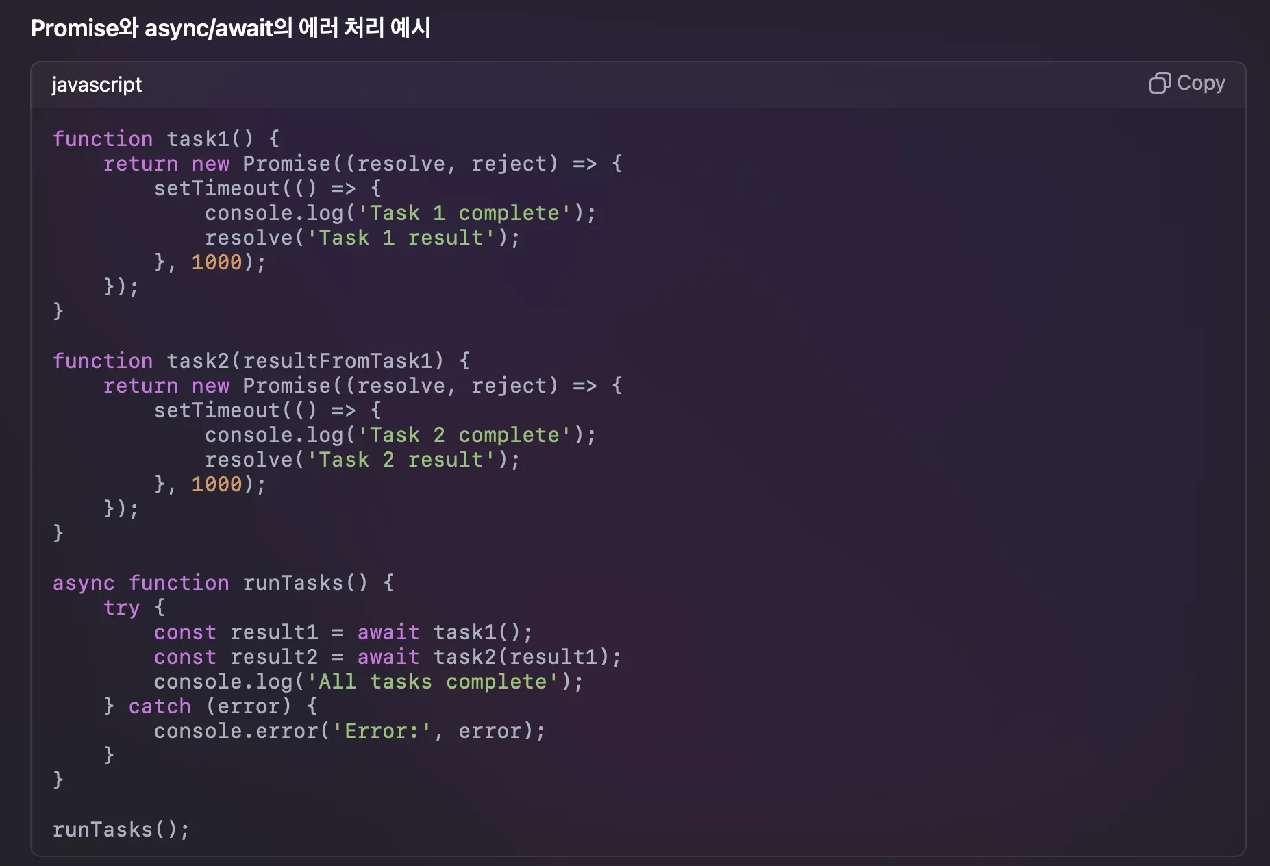- 에러 전파 어려움: 비동기 함수가 중첩될수록 각 콜백에서 발생한 에러를 상위로 전파시키기가 어렵습니다. 각 단계에서 에러를 캐치하고 처리해야 하기 때문에 코드 복잡성이 증가합니다.