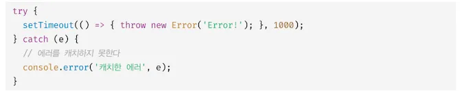 따라서 setTimeout 함수의 콜백 함수가 발생시킨 에러는 catch 블록에서 캐치되지 않는다.