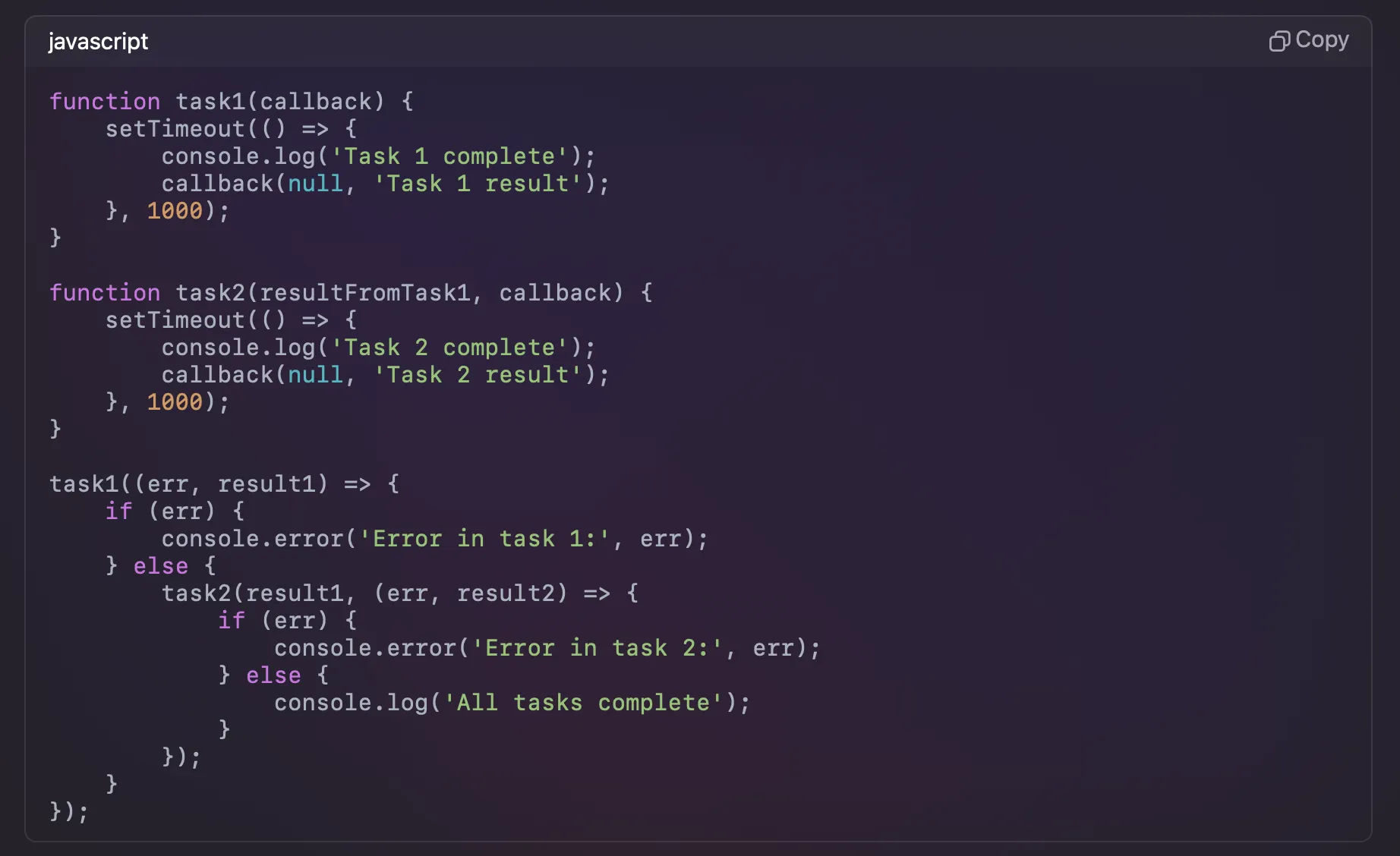 - 에러 전파 어려움: 비동기 함수가 중첩될수록 각 콜백에서 발생한 에러를 상위로 전파시키기가 어렵습니다. 각 단계에서 에러를 캐치하고 처리해야 하기 때문에 코드 복잡성이 증가합니다.