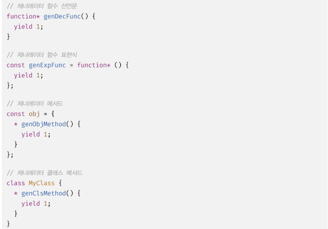 애스터리스크(*)의 위치는 function 키워드와 함수 이름 사이라면 이디든지 상관없다. 다음 예제의 제너레이터 함수는 모두 유효하다.