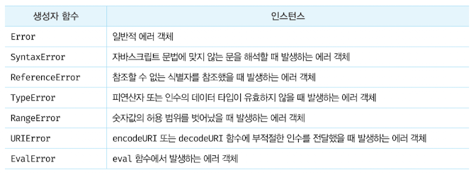 자바스크립트는 Error 생성자 함수를 포함해 7가지의 에러 객체를 생성할 수 있는 Error 생성자 함수를 제공한다.