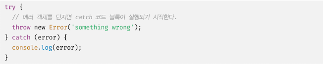 에러를 발생시키려면 try 코드 블록에서 throw 문으로 에러 객체를 던져야 한다.