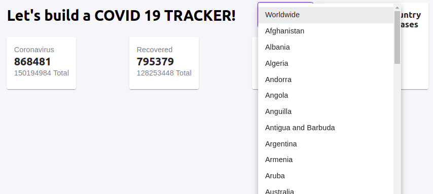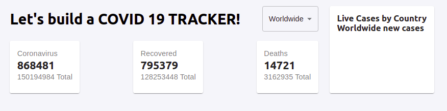 <h1>Let's build a COVID 19 TRACKER!</h1>