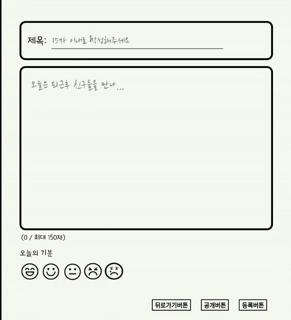짧은 프로젝트 일정으로 인해 지도API 를 이용하여 일기의 배경이 되는 장소를 저장하는 기능을 구현하지 못해 아쉬웠다.