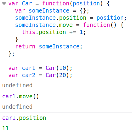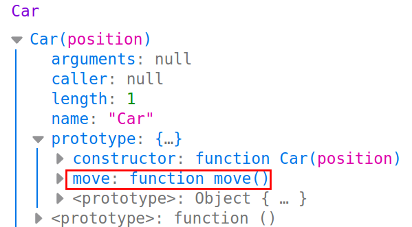 객체 Car 의 prototype 이라는 객체 안에 move 메소드를 추가하여 사용할 수 있게 만든다.