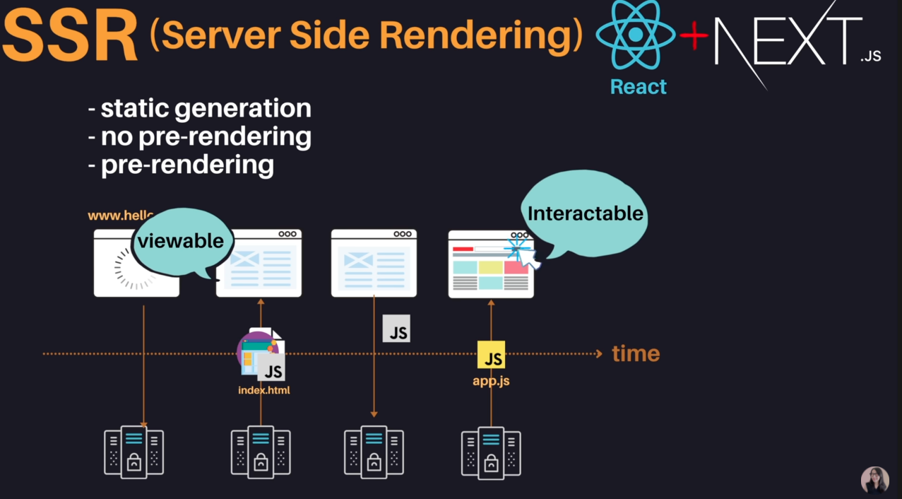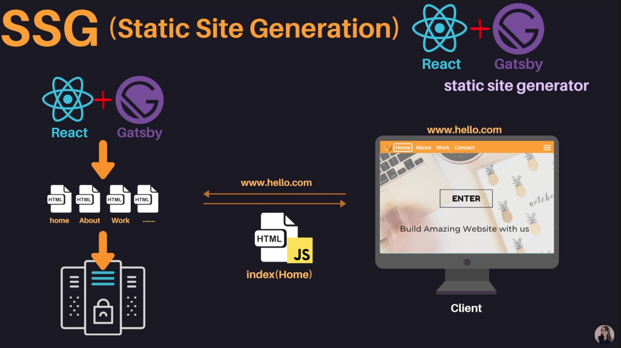 리액트로 만든 앱을 정적으로 웹페이지를 미리 생성해 서버에 배포놓는다. 추가적으로 서버로부터 데이터를 받아오거나 동적으로 처리해야 하는 로직이 있을 경우 자바스크립트 파일을 함께 가지고 있을 수 있기 때문에 동적인 요소도 추가할 수 있다.