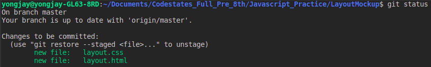 과제 진행시 처음 저장소를 Clone 하면 모든 파일은 Tracked이면서 Unmodified 상태이다. 하지만, 개인적인 프로젝트 또는 연습을 할 때는 작업완료 후 git status 명령으로 파일의 상태를 확인하면 아래와 같이,