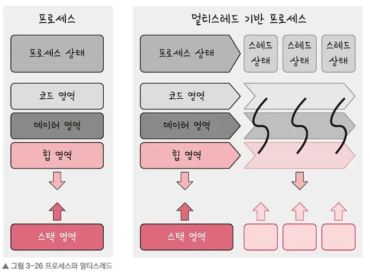 • Unlike processes, which each have their own code, data, and heap,threads share the code, data, and heap of their process. → This allows multiple tasks to run concurrently within a single process.
