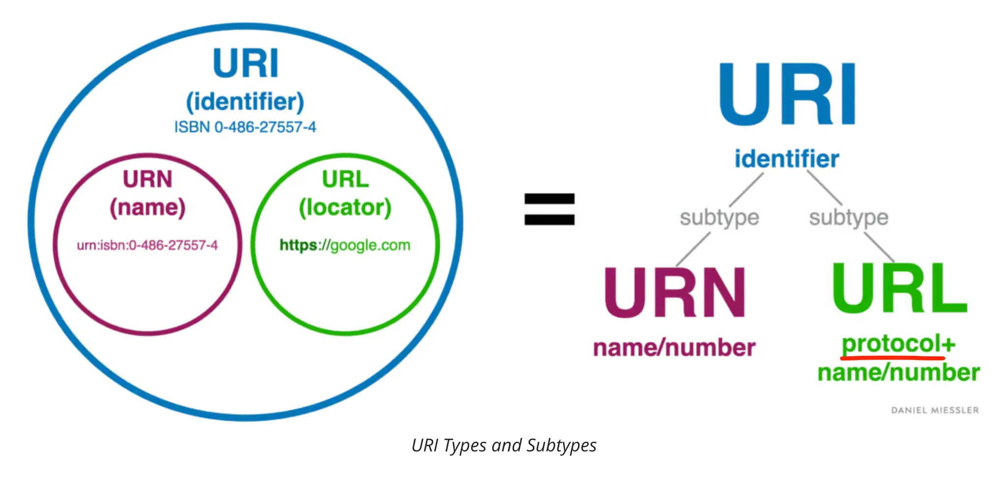 So a URI or URN is like your name, and a URL is a specific subtype of URI that’s like your name combined with your address.