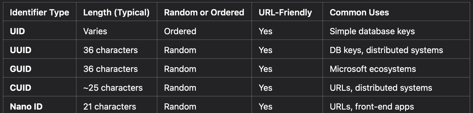 Unique identifiers are crucial for ensuring uniqueness, reducing collision probability, and enabling easy tracking in various systems. Below is a summary of common identifier types: